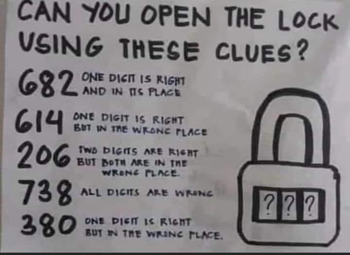 The puzzle was to be interpreted as follows: you have a three-digit combination lock with numbers 0-9; so 1,000 possible combinations in total. Bulls and Cows-style, a series of clues indicate how “close” each of several pre-established “guesses” are. In “bulls and