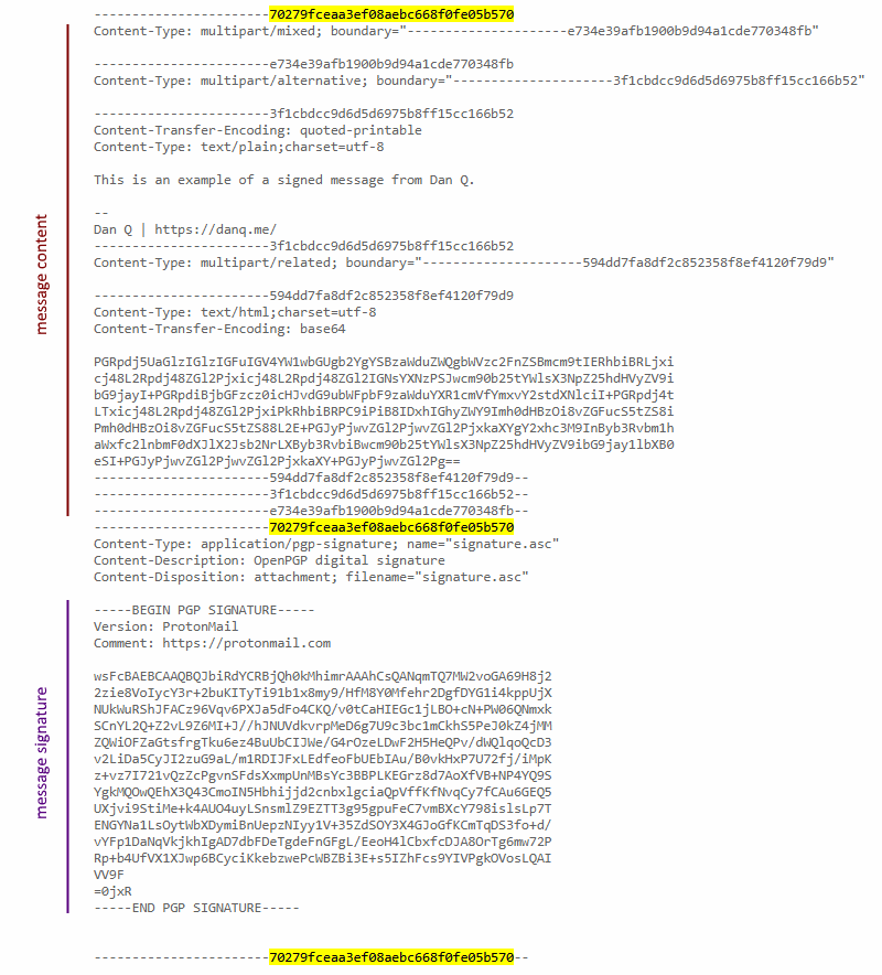 View the raw/original message: it’ll be divided into two parts delineated by a boundary marked by a random string. The first part will contain the message content (including any attachments). The second part will contain a couple of headers and the message signature: the screenshot below illustrates this: