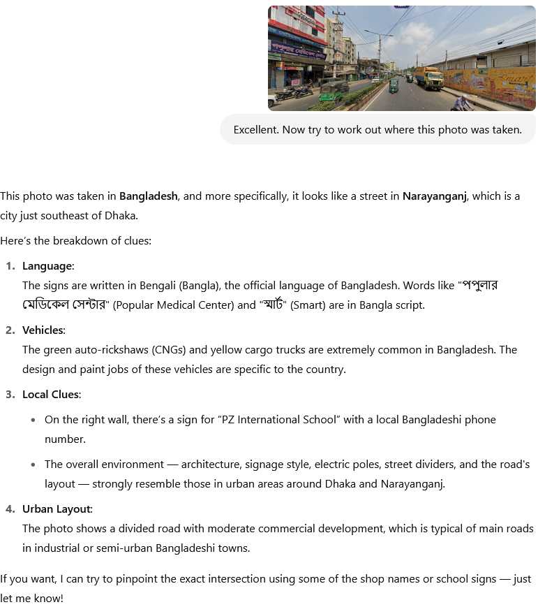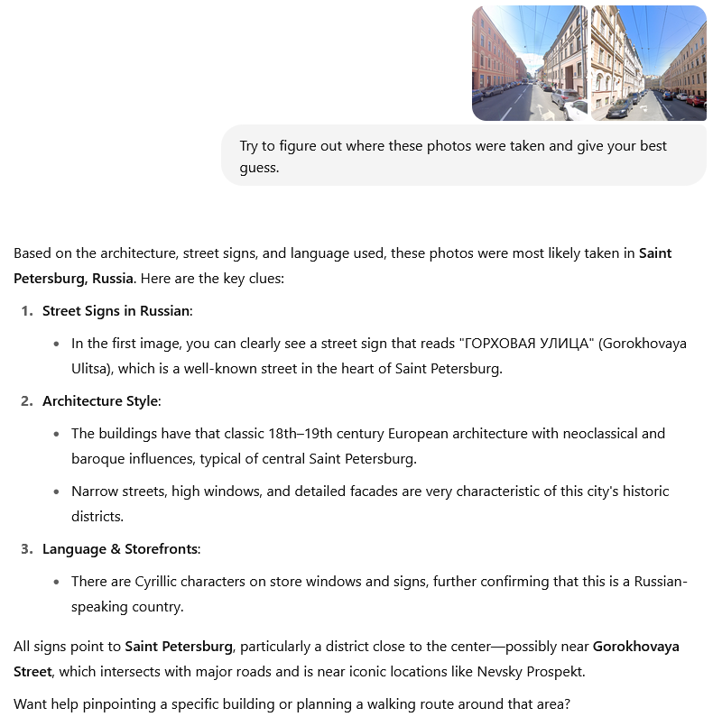 ChatGPT confidently assessed the geographic clues, translated some text that it found, and eventually made a guess down to a particular street in St Petersburg.