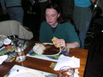 One final highlight of the weekend that I’ll share with you is of a meal at the Neuadd Arms. On their menu they list a number of curry dishes, all rated by heat with a series of “radiation” symbols by each, from one to three. Except for their Phaal, which has five, and promises a medal to anybody who can clear their plate. Claire, being Claire, tried it. She didn’t manage to clear her plate, but that’s probably for the best, because the room was starting to feel warm and tingly as a result of the heat exuded by the dish. We all tried a taste of it, once she’d admitted defeat, which was quite painful – but tasty. Claire’s promised to get herself into “curry training” for next year.