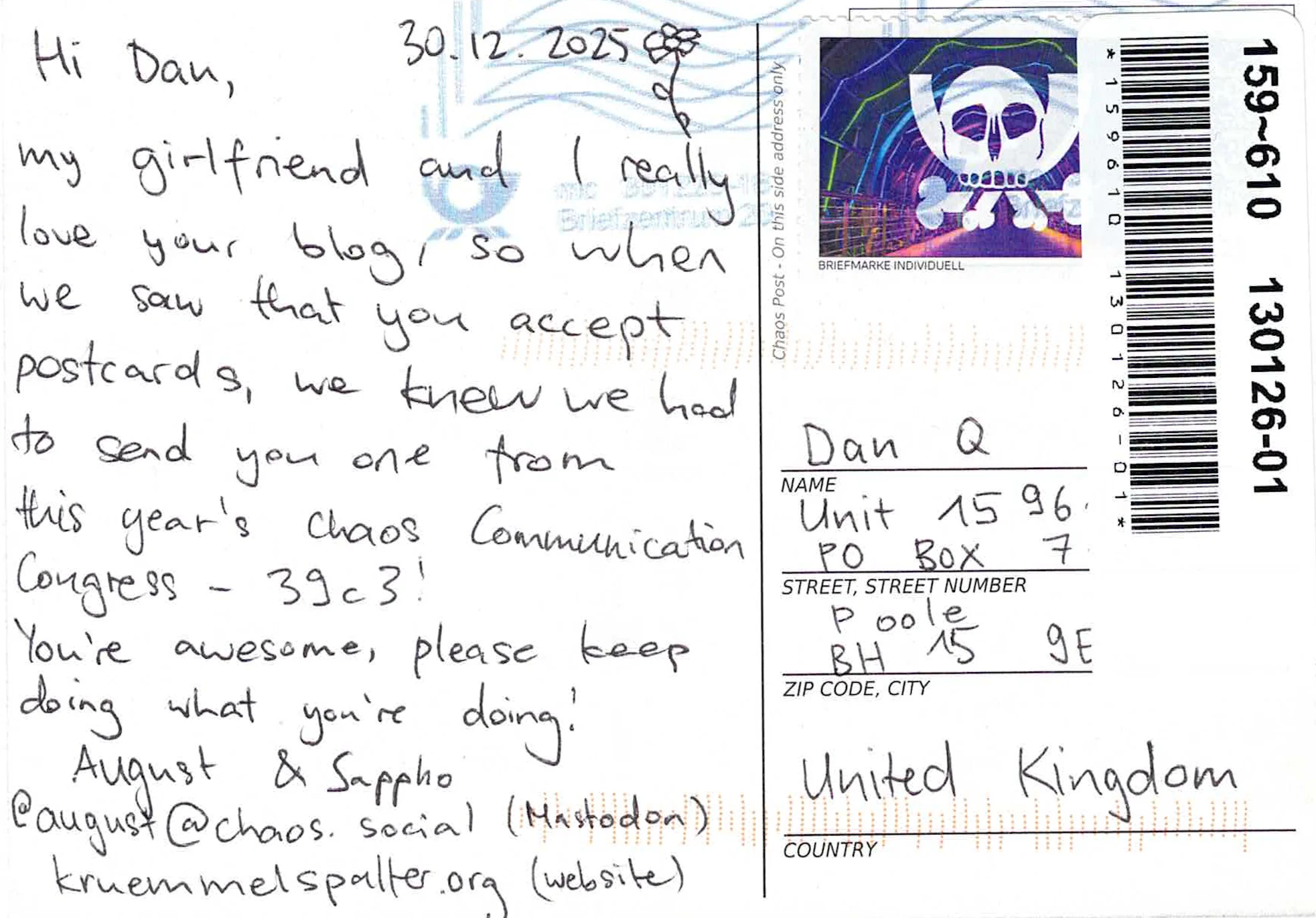 my girlfriend and I really love your blog, so when we saw that you accept postcards, we knew we had to send you one from this year's Chaos Communication Congress - 39c3!