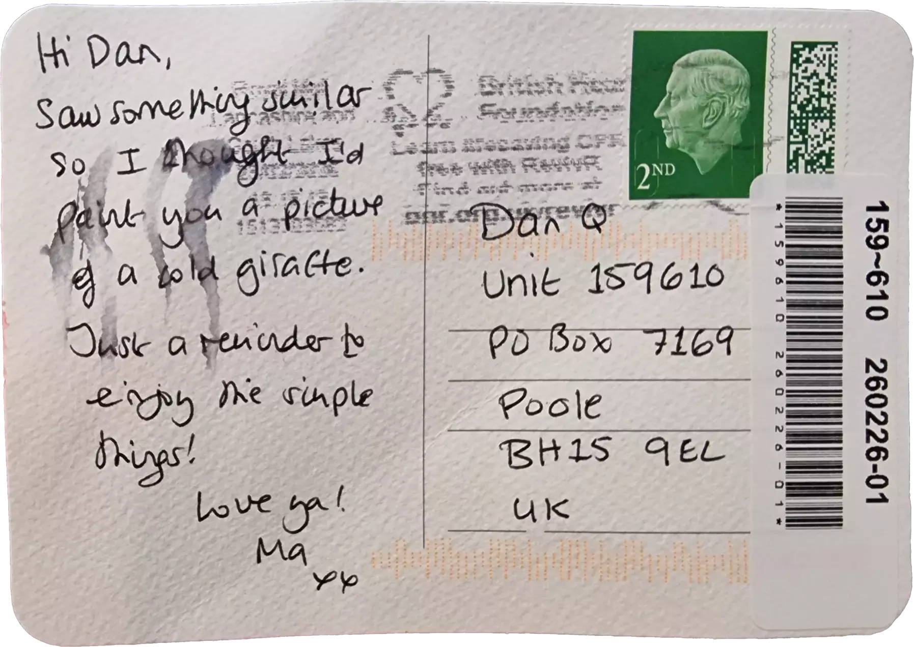 Returning a comment you left on my personal site, from my days of Twitch streaming I used to send out parcels to competition winners with a postcard. Anyway, here you go!
