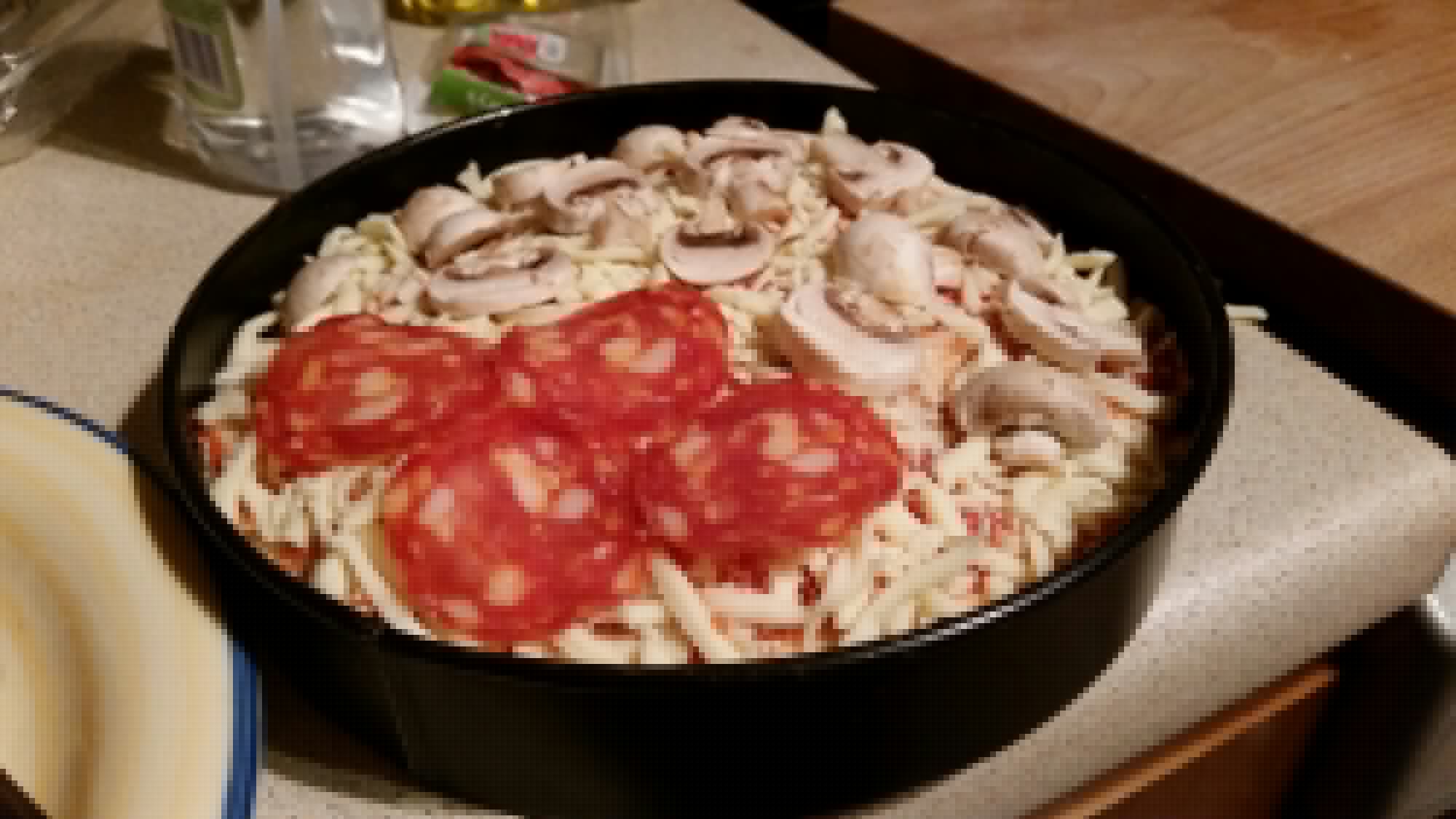 from bottom to top – dough, tomato, cheese, pepperoni & mushrooms, dough, tomato, cheese, pepperoni & mushrooms, dough, tomato, cheese, pepperoni & mushrooms, dough, tomato, cheese,