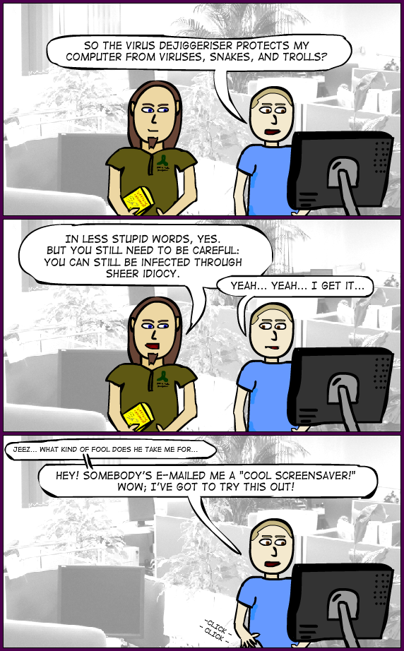 Edit: A minor bug in the RSS script resulted in some folks being able to read Wednesday, Thursday, Friday and Saturday’s comics before they were released. This has now been fixed. My apologies to those of you who’ll now have to do without any new episodes until Sunday.