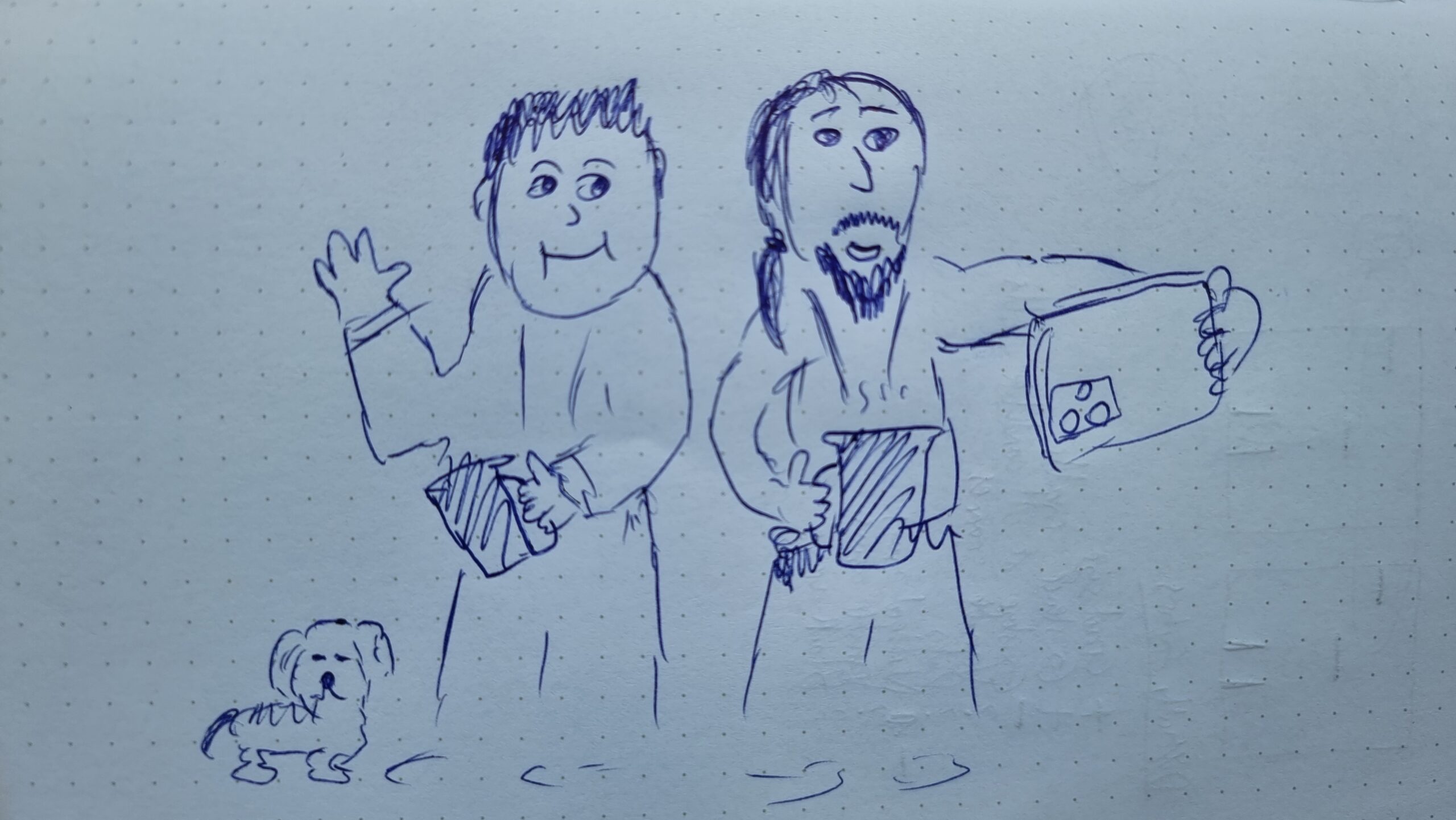 Unfortunately I can’t draw. He looks much less like a potato in real life! Think I got his dog right, though.