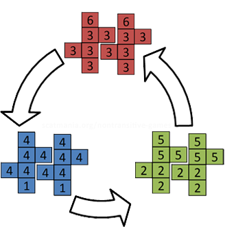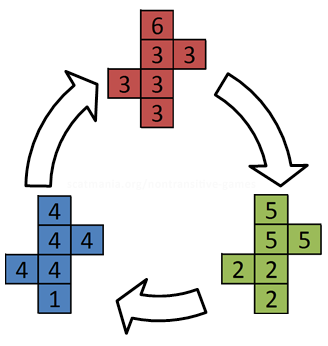 tricks and gambling games. Typically: the red die will beat the green die, the green die will beat the blue die, and the blue die will beat the red die! (think Rock, Paper,