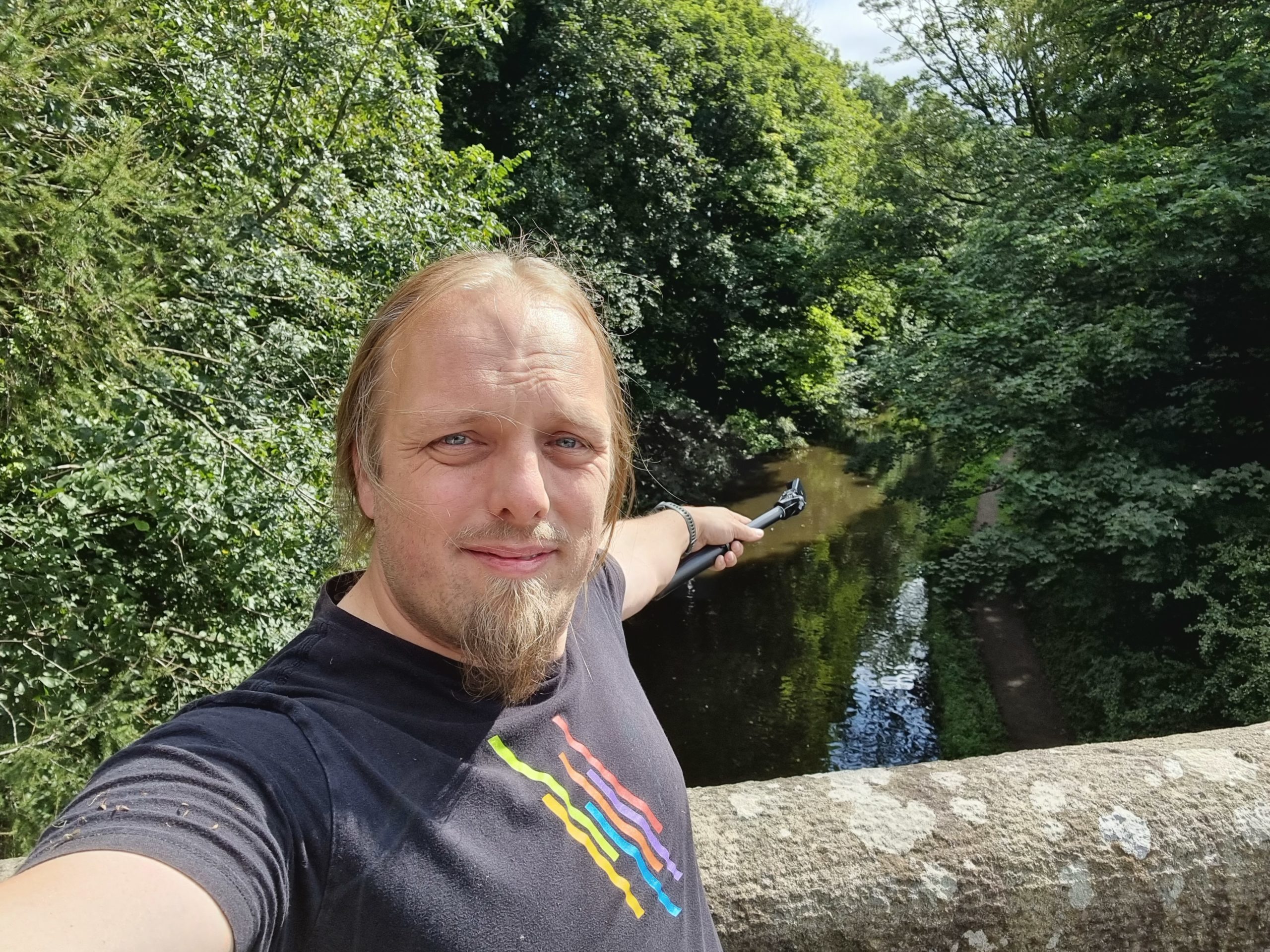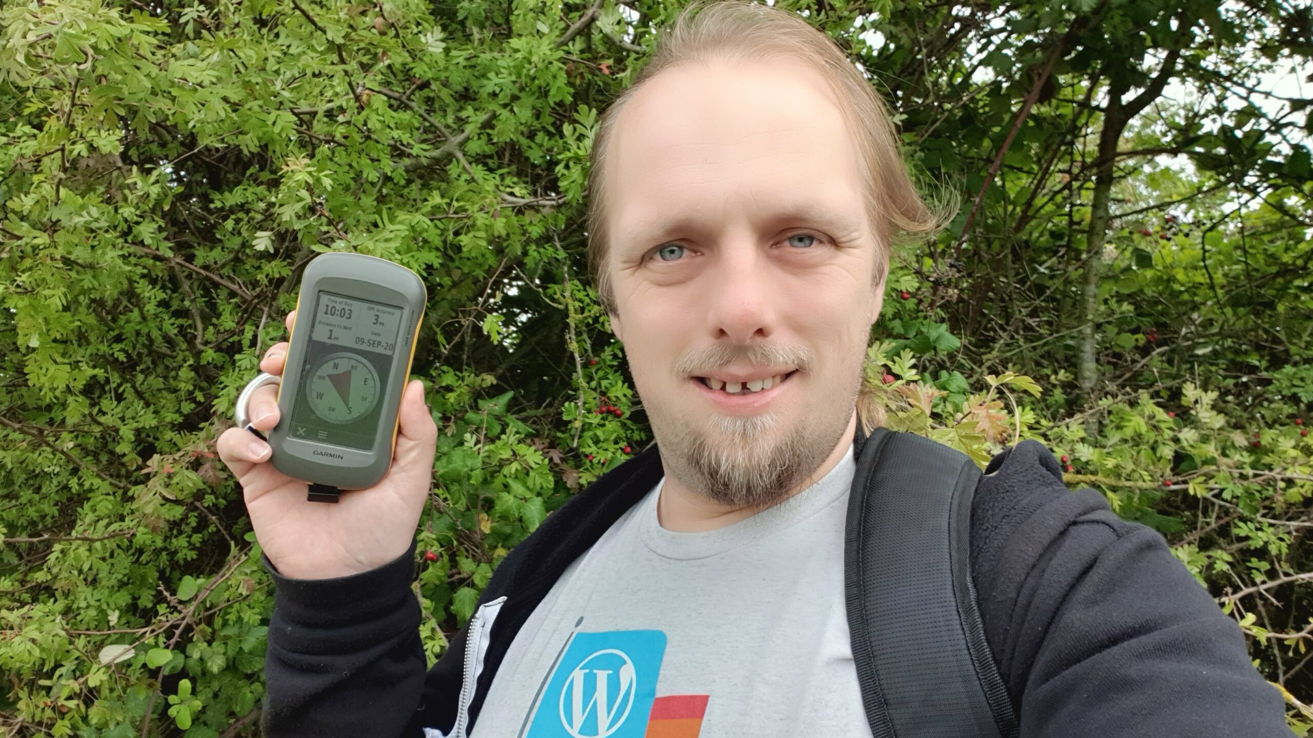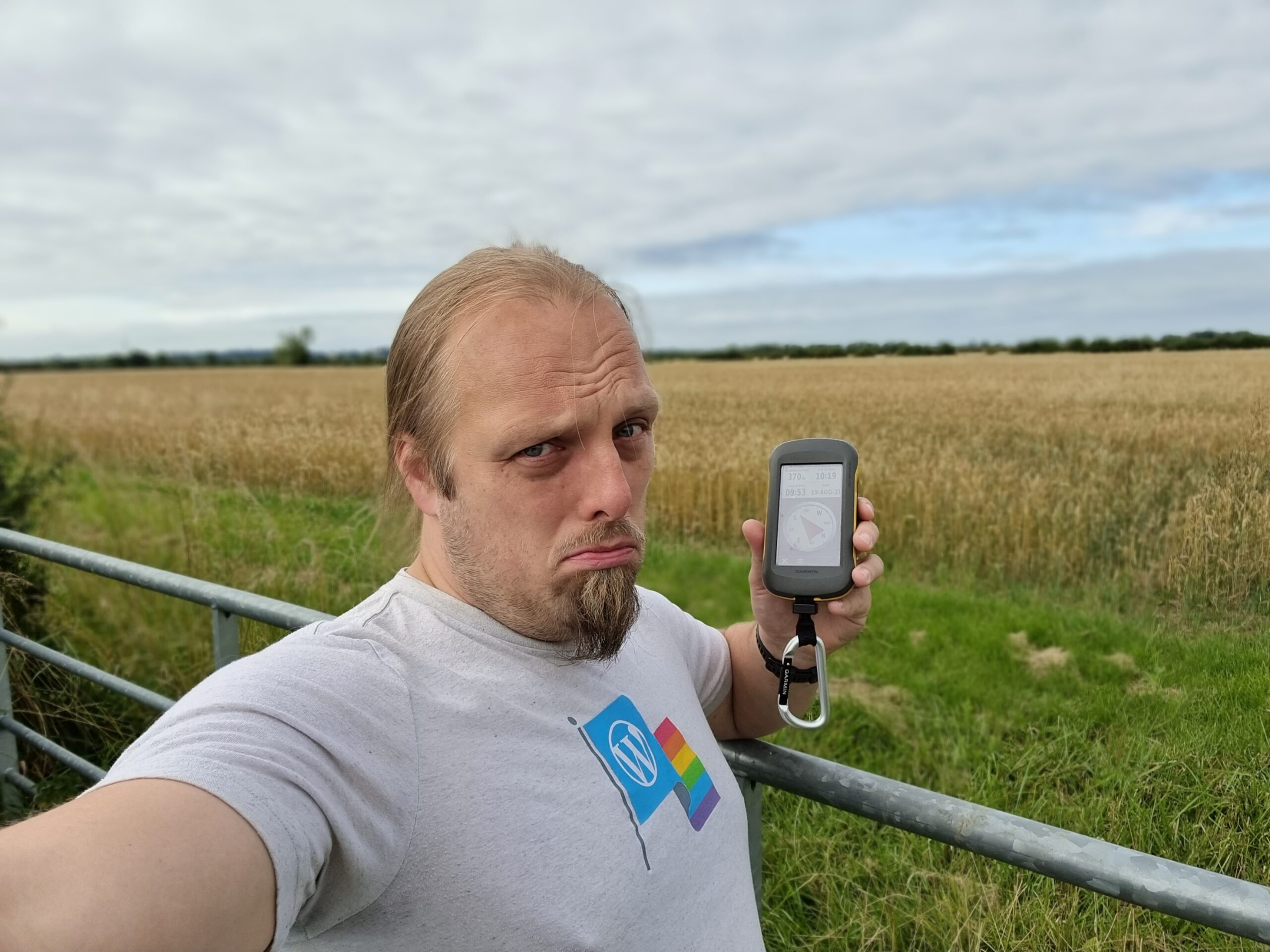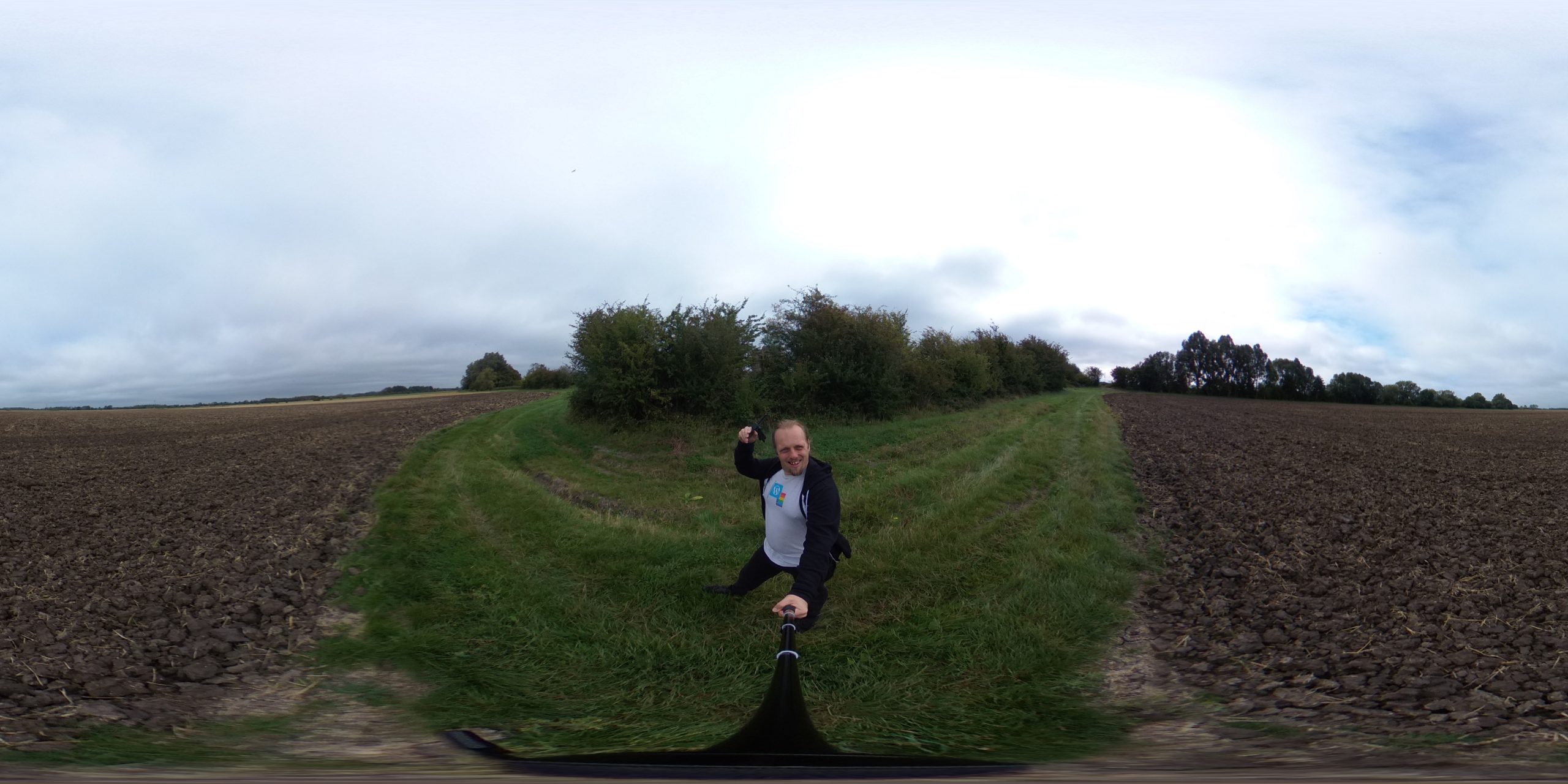 I abandoned my bike for the final 50 metres, trekking through the thick grass of an unmown meadow to the hashpoint and arriving around 19:00. No panoramic photo today it’s too dark – but you get a silly grin.