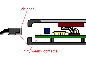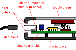A cross-section of a Nokia N900, showing how the USB port is mounted directly to the circuit board, and doesn't touch the hard plastic case.