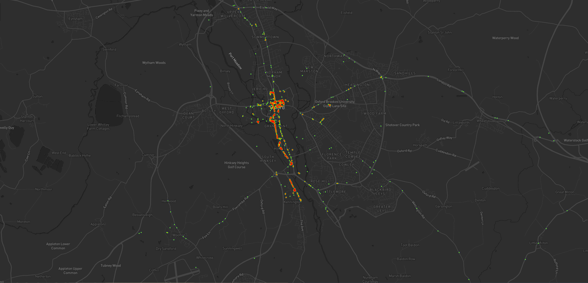 - My volunteering at Samaritans stands out more-clearly, as do specific venues inside Oxford: bars, theatres, and cinemas – it’s the kind of heatmap that screams “this person doesn’t have kids; they can do whatever they like!”
