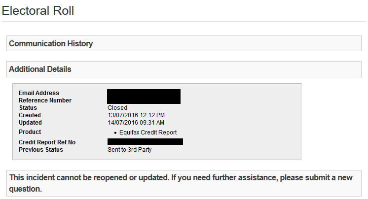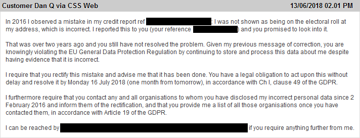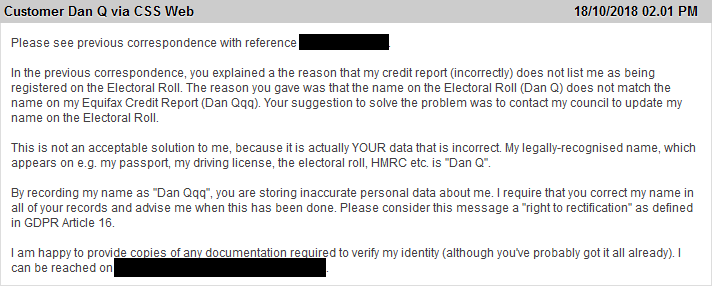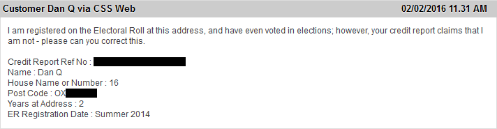 their software were preventing them from joining-the-dots between my credit report and the Electoral Roll. I’d also assumed that this nudge would have them either fix their software… or