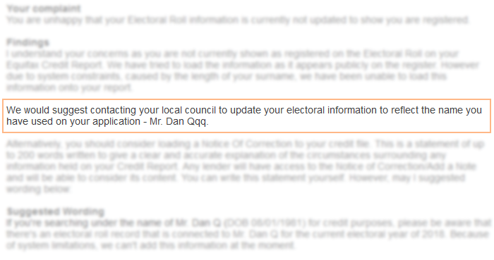 Equifax’s suggested solution to the problem on my credit report? Change my name on the Electoral Roll to match the (incorrect) name they store in their systems (to work around