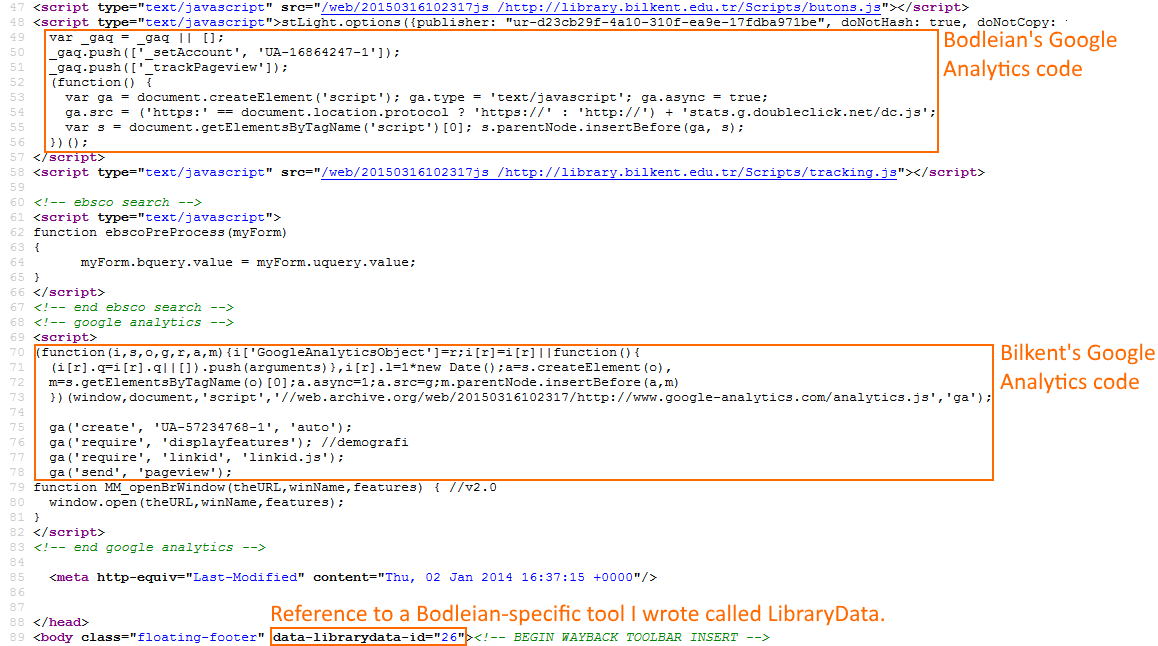 In their HTML source code, you can see both the Bodleian’s Google Analytics code (which they failed to remove) but also their own. And a data- attribute related to a project I wrote