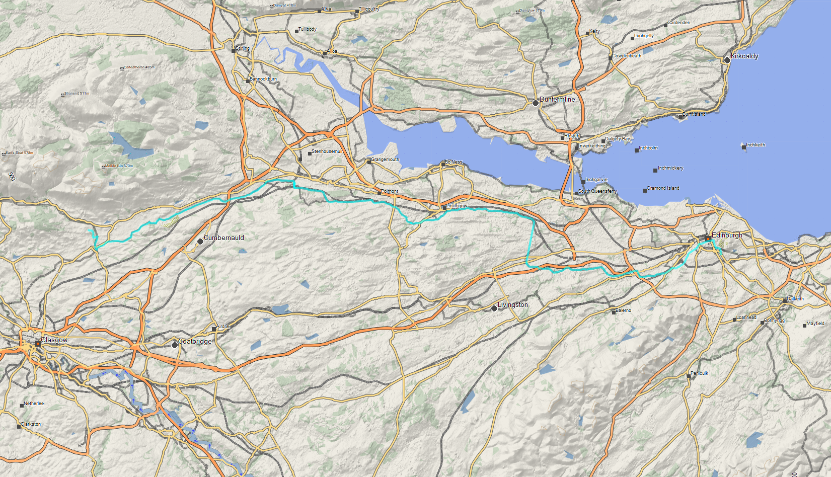 of Bonny Water, from which the rivers flow into the Forth. From a hydrogeological perspective, this is the half-way point between Edinburgh and Glasgow.