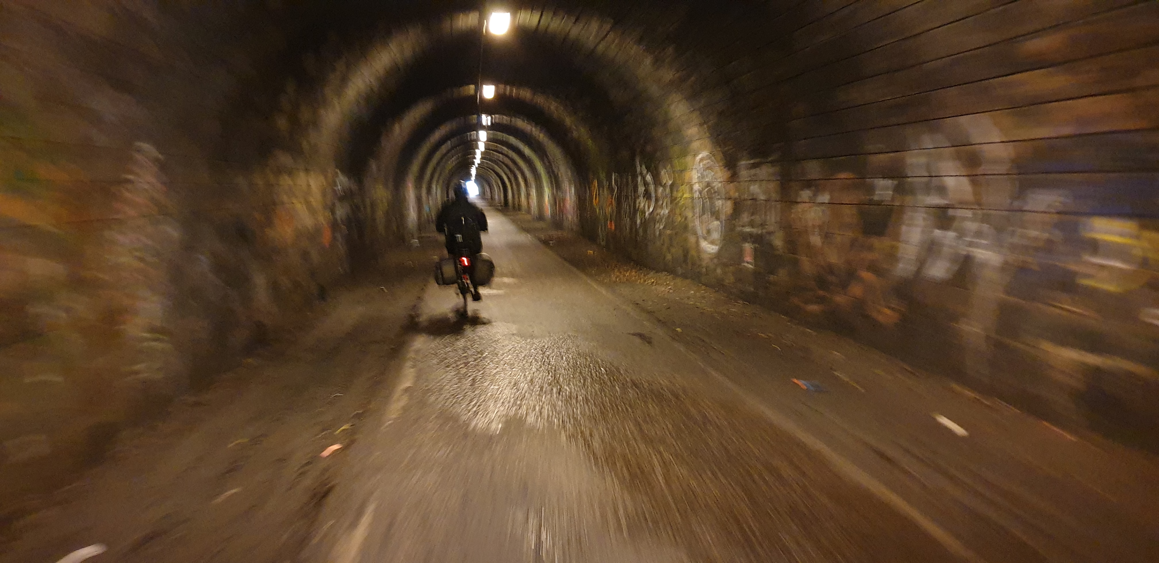 Wet, cold, slippery, narrow, and cobblestoned for the benefit of the horses that no-longer pull boats through this passage, we needed to dismount and push our bikes through. This proved