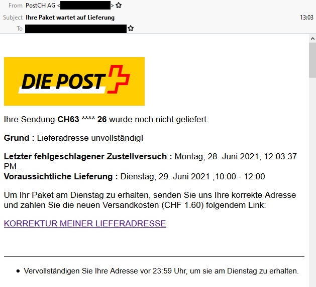 Parcel fee scams aren’t limited to the Anglophone world. Apparently Swiss Post tried to visit me on Monday, even though I’m about 500 miles outside of their delivery area!