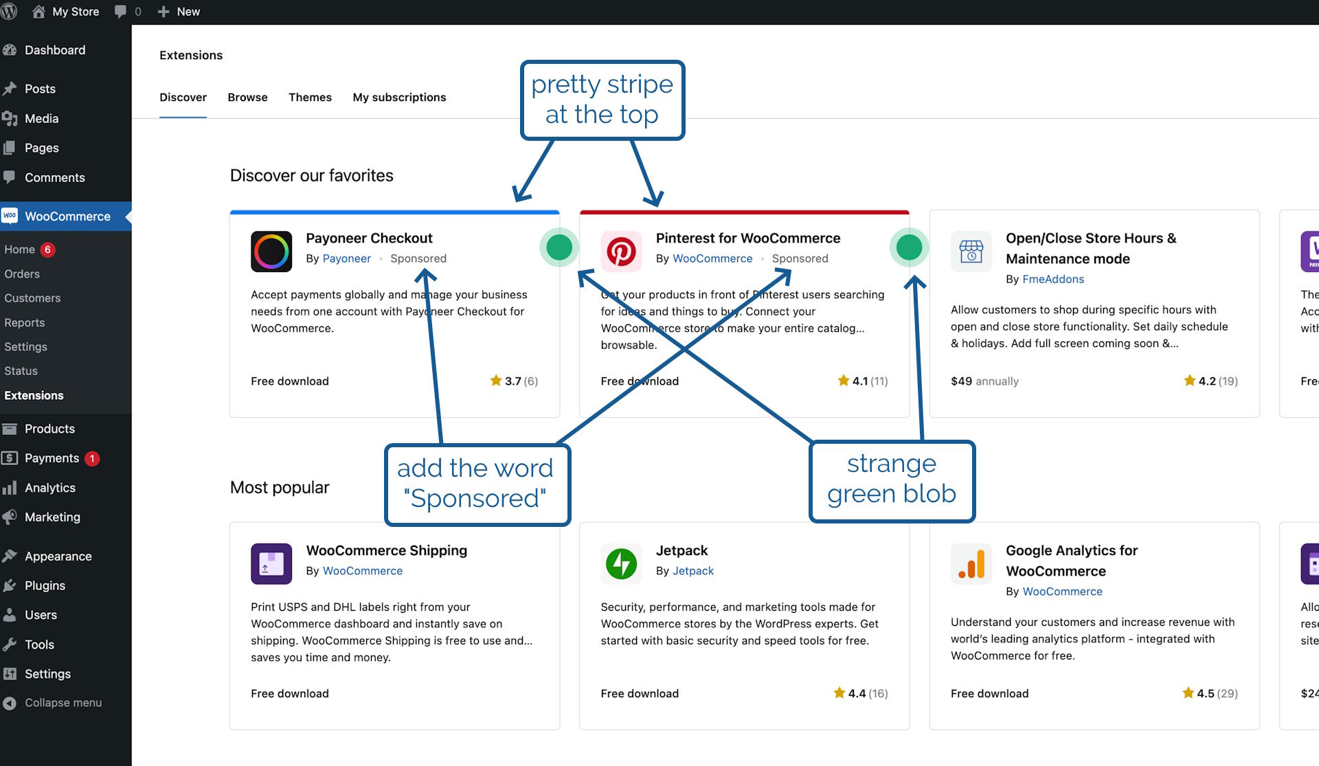 In the future, we’ll be adding sponsored products to the marketplace listing, but we want to be transparent about it so yesterday I was working on some code that would determine from the appropriate API whether an extension was sponsored and then style it differently to make this clear. I took a look at the proposal from the designer attached to the project, which called for