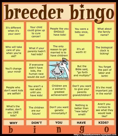 “Breeder Bingo” card. Complete a line, get a free case of contraceptives!