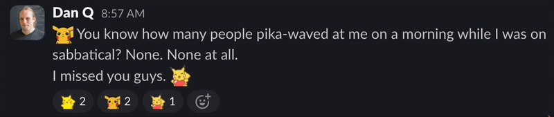 signed in to work Slack on my personal phone, but I’d come to legitimise this bit of undisciplined work/life-balance interaction by virtue of the fact that, for example, walking the dog